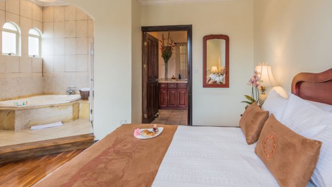 Master Suite Esta habitación posee techos abovedados, candelabros de hierro, cama king, lavabos de mármol, bañera de hidromasaje.